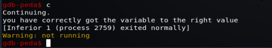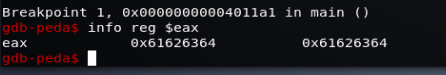 다음 브레이크 포인트가 잘 걸렸는지 확인한 후에 eax의 레지스터 값을 확인해보면 정상적으로 0x61626364로 바뀐 것을 알 수가 있다. 이제 continue명령어를 통해서 제대로 값이 나오는지 확인해보자.