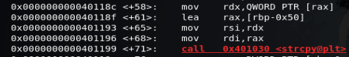 이런 내용들을 볼 수 있다. 여기서 rsi를 rdi로 복사하는 strcpy이기 때문에 rsi는 argv[1], rdi는 buffer라는 사실을 알 수 있다. 여기서 우리는 buffer가 rax로 부터 왔다는 것도 알 수 있으므로 rax의 주소는 rbp-0x50이라는 사실을 알 수 있다.