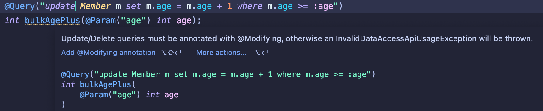 @Query("update Member m set m.age = m.age + 1 where m.age >= :age")