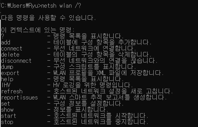 다음 netsh wlan /?를 통해 부속 명령어들을 보면 맨 아래에서 3번째에 show라는 명령어가 있습니다.