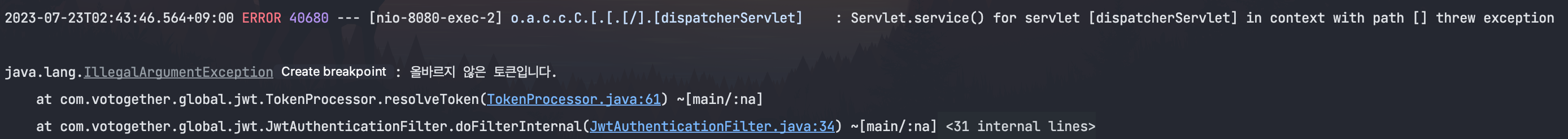 토큰을 보낸 적이 없는데 이런 예외 메시지와 함께 에러로그가 찍히는 걸 확인할 수 있었다.